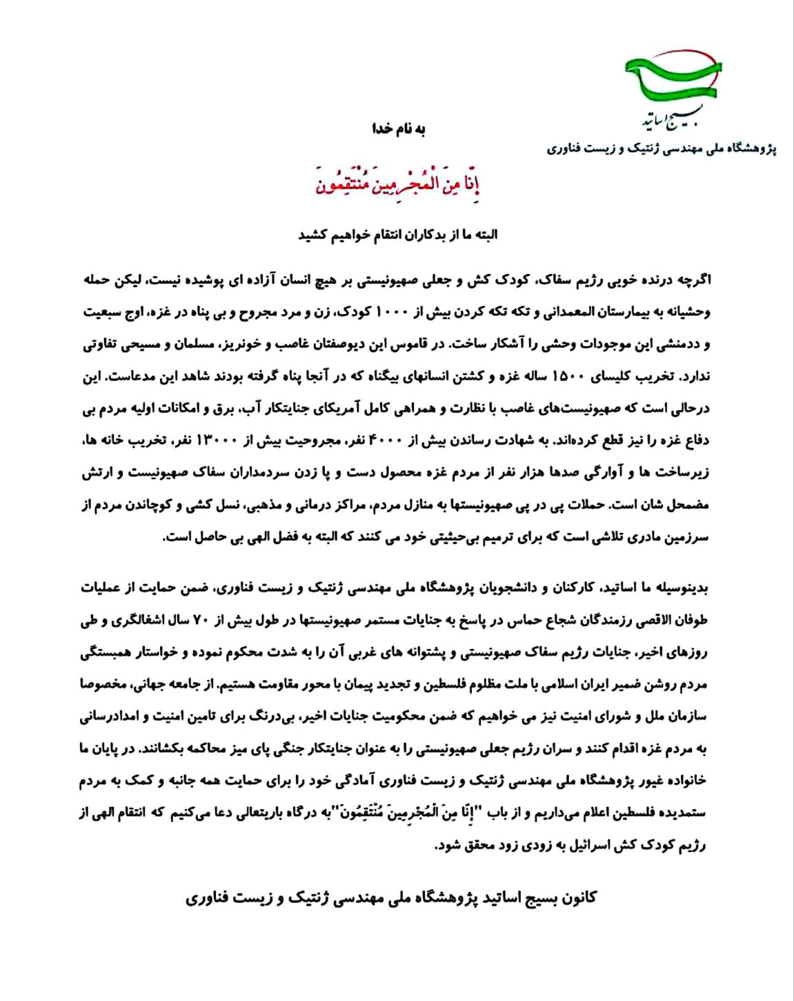 بدينوسیله ما اساتید، کارکنان و دانشجویان پژوهشگاه ملی مهندسی ژنتيک و زيست فناوری، ضمن حمايت از عمليات طوفان الاقصی رزمندگان شجاع حماس در پاسخ به جنایات مستمر صهیونیستها در طول بيش از 70 سال اشغالگری و طی روزهای اخیر، جنایات رژیم سفاک صهیونیستی و پشتوانه های غربی آن را به شدت محکوم نموده و خواستار همبستگی مردم روشن ضمیر ایران اسلامی با ملت مظلوم فلسطین و تجدید پیمان با محور مقاومت هستيم. از جامعه جهانی، مخصوصا سازمان ملل و شورای امنیت نیز می خواهيم که ضمن محکومیت جنایات اخیر، بی‌درنگ برای تامین امنیت و امداد‌رسانی به مردم غزه اقدام کنند و سران رژیم جعلی صهیونیستی را به عنوان جنایتکار جنگی پای میز محاکمه بکشانند. در پايان ما خانواده غیور پژوهشگاه ملی مهندسی ژنتيک و زيست فناوری آمادگی خود را برای حمايت همه جانبه و کمک به مردم ستمديده فلسطين اعلام می¬داریم و از باب "إِنَّا مِنَ الْمُجْرِمِينَ مُنْتَقِمُونَ"به درگاه باريتعالی دعا می¬کنیم که انتقام الهی از رژيم کودک کش اسرائيل به زودی زود محقق شود.